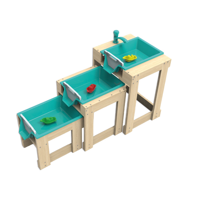 Komplektā ir trīs kaskādes līmeņu plastmasas trauki, kas ļauj ūdenim brīvi plūst no viena līmeņa uz citu. Tas sniedz bērniem iespēju eksperimentēt, novērot ūdens kustību un veidot savas spēļu scenārijus. Komplektā ir arī trīs plastmasas paliktņi (36x25x6,6 cm) un trīs plastmasas laivas (10,3x5,3x3,8 cm).
