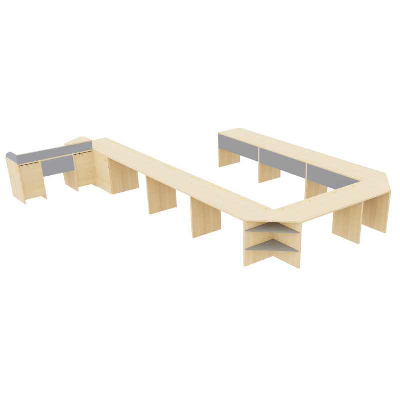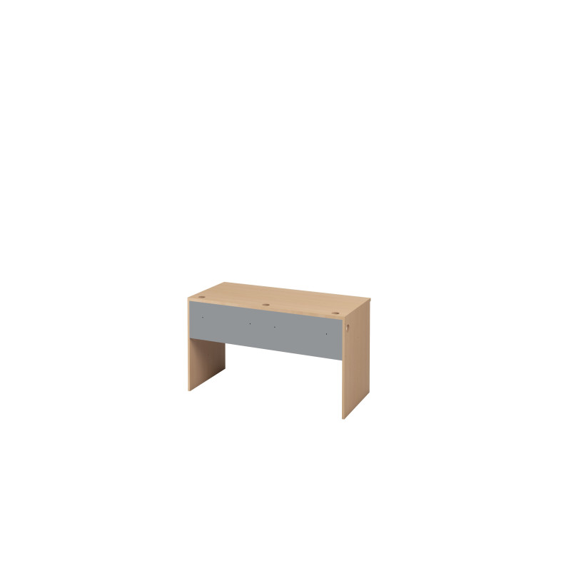 Galda virsma izgatavota no 25 mm biezas augstas kvalitātes laminētas kokskaidu plātnes bērza krāsā, kas ir izturīga pret ikdienas nodilumu. Galda sāni – no 18 mm biezas laminētas plātnes, arī bērza krāsā. Konstrukciju papildina 18 mm biezas pelēkas laminētas detaļas, kas piešķir mēbelei vienotu un modernu izskatu.