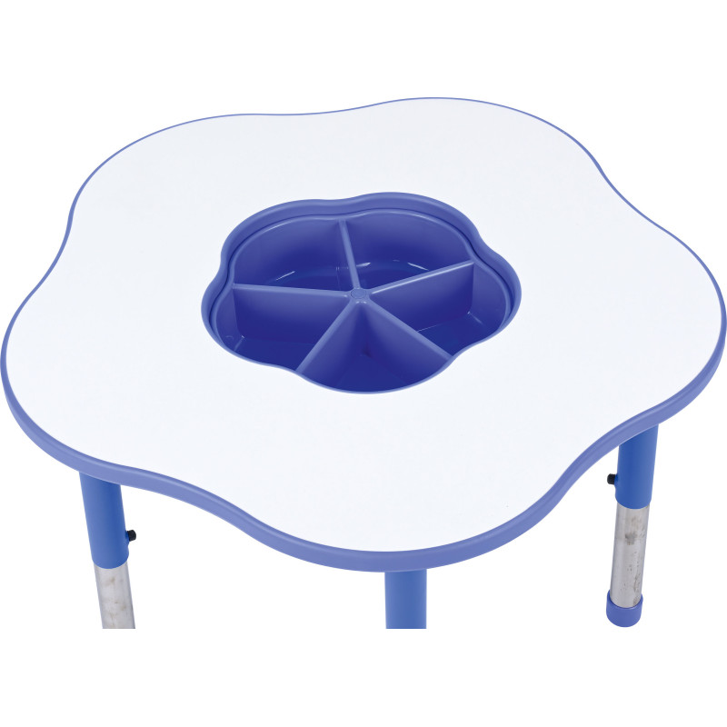 Stabilās tērauda kājas nodrošina drošību un izturību, bet regulējamais augstums ļauj viegli pielāgot galdiņu dažāda vecuma bērniem. Galdiņa centrā ir iebūvēts ērts izņemams organizators zīmuļu, flomāsteru vai citu piederumu glabāšanai – tas palīdz uzturēt kārtību un atvieglo kopšanu.