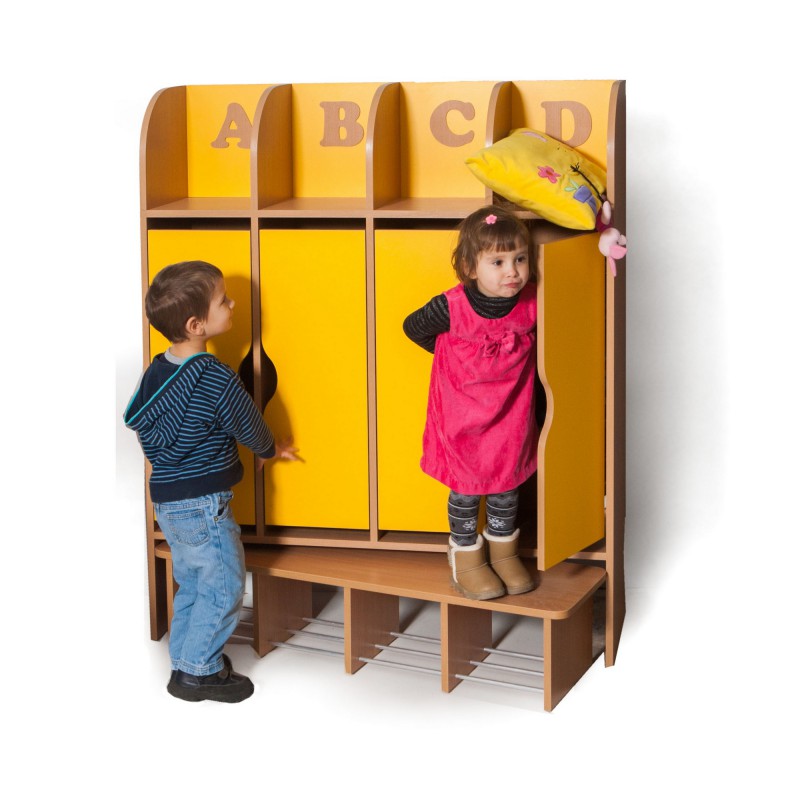 Alfabēta skapis ir interesantas formas un unikāla dizaina. Bērni pārģērbšanās laikā jutīsies ērti, un viņi var ne tikai pakārt lietas uz āķiem, bet arī novietot tās savā atsevišķā plauktā.