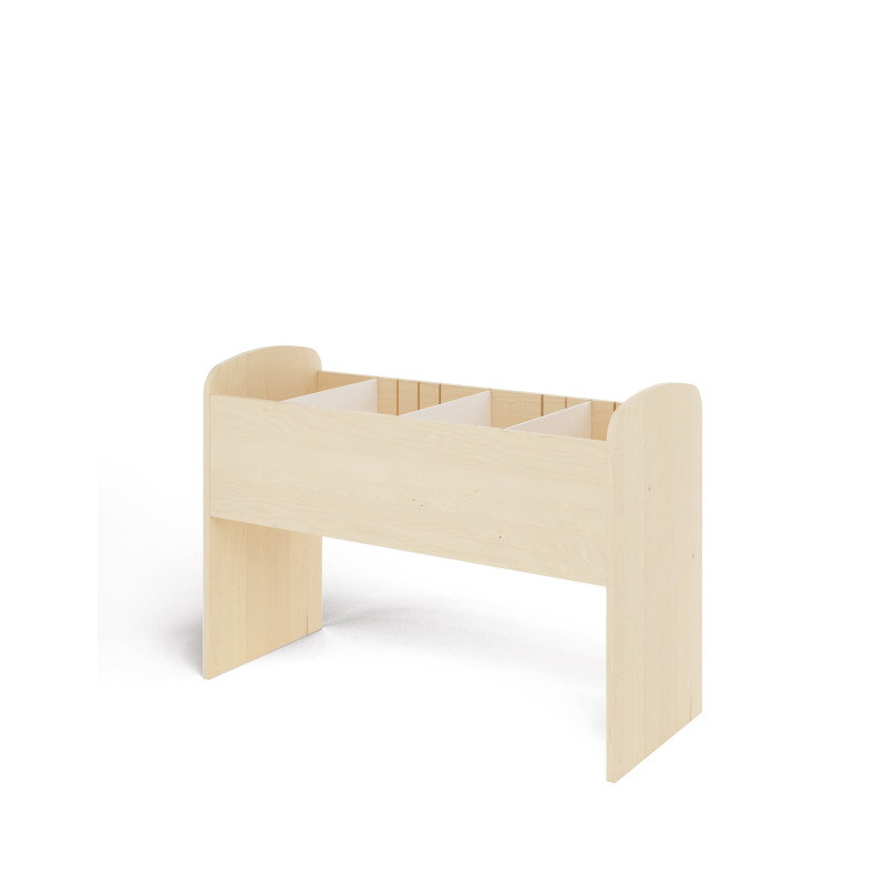 Brīvi novietojams grāmatplaukts ar četrām nišām, lieliski piemērots grāmatām un citiem priekšmetiem. Izgatavots no bērza krāsas kokskaidu plātnes, papildināts ar trim baltas krāsas MDF plauktiem, kuru augstumu var regulēt, nodrošinot elastību telpas organizēšanā. Lieliski piemērots jebkuram interjeram, apvienojot funkcionalitāti un estētiku.
