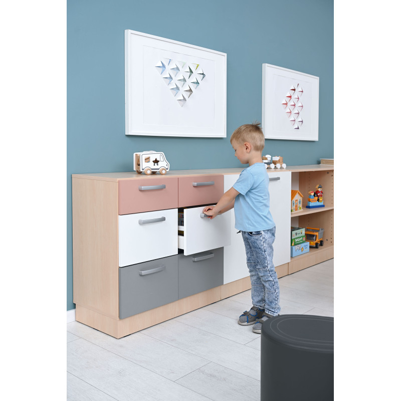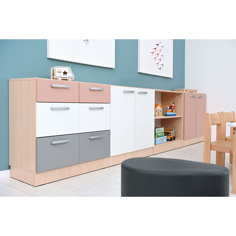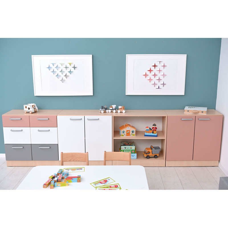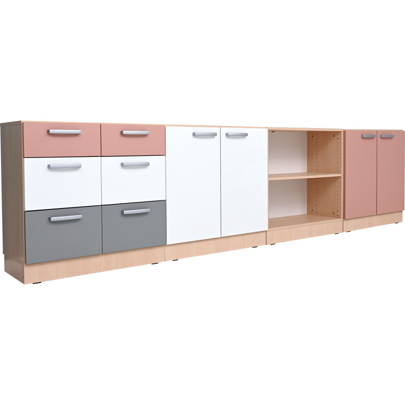 Šis funkcionālais un estētiskais mēbeļu komplekts ir izstrādāts ērtai lietu uzglabāšanai izglītības iestādēs. Pateicoties modulārajai konstrukcijai, skapīšus var viegli pielāgot dažādām telpām, nodrošinot kārtību un ergonomisku lietošanu.
