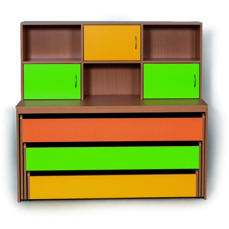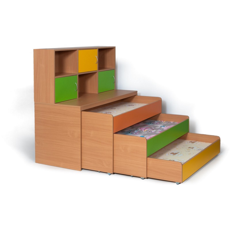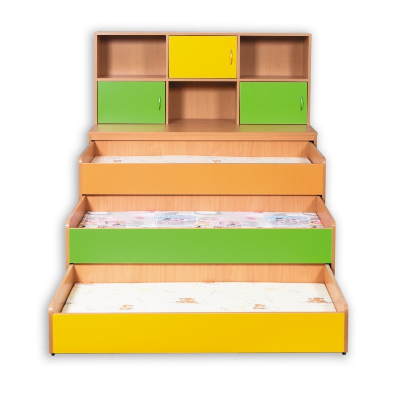 Bērnu gultiņa ir izgatavota no LMDP (18 mm bieza). Bērnu gultiņa ir funkcionāla, jo tajā var gulēt līdz trim bērniem, bet to var izmantot arī kā naktsgaldiņu. Skapītis virs gultiņas ļaus glabāt arī dažādas spēles vai priekšmetus. Bērnu gultiņas sāni ir no dižskābarža. Bērnu gultiņas priekšpuses krāsu var izvēlēties - dižskābarža, dzeltenā, sarkanā, zilganzaļā, zaļā, oranžā, zilā krāsā. Bērnu gultiņas riteņi ir gumijoti un izturīgi, nesaskrāpē grīdu un viegli ripo. Bērnu gultiņa tiek pārdota bez matrača. Šīm gultiņām paredzētos matračus (varat pievienot matračus 140x60 cm; 135x60 cm; 130x60 cm) atradīsiet mūsu sadaļā "Matrači".