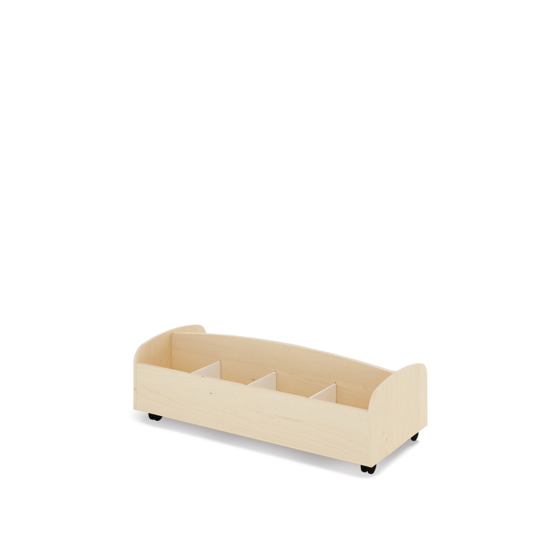 Mobilā divpusējā mantu kaste ir ideāli piemērota grāmatām un aksesuāriem. Konstrukcija izgatavota no bērza krāsas kokskaidu plātnes, ar krēmkrāsas starpsienu, kas nodrošina papildu funkcionalitāti. Mēbelē ir trīs baltie, regulējama augstuma plaukti no MDF plātnes, kas ļauj pielāgot telpu atbilstoši vajadzībām. Stabilitāti un mobilitāti nodrošina četri riteņi un mazāka sānu daļa no MDF plātnes.