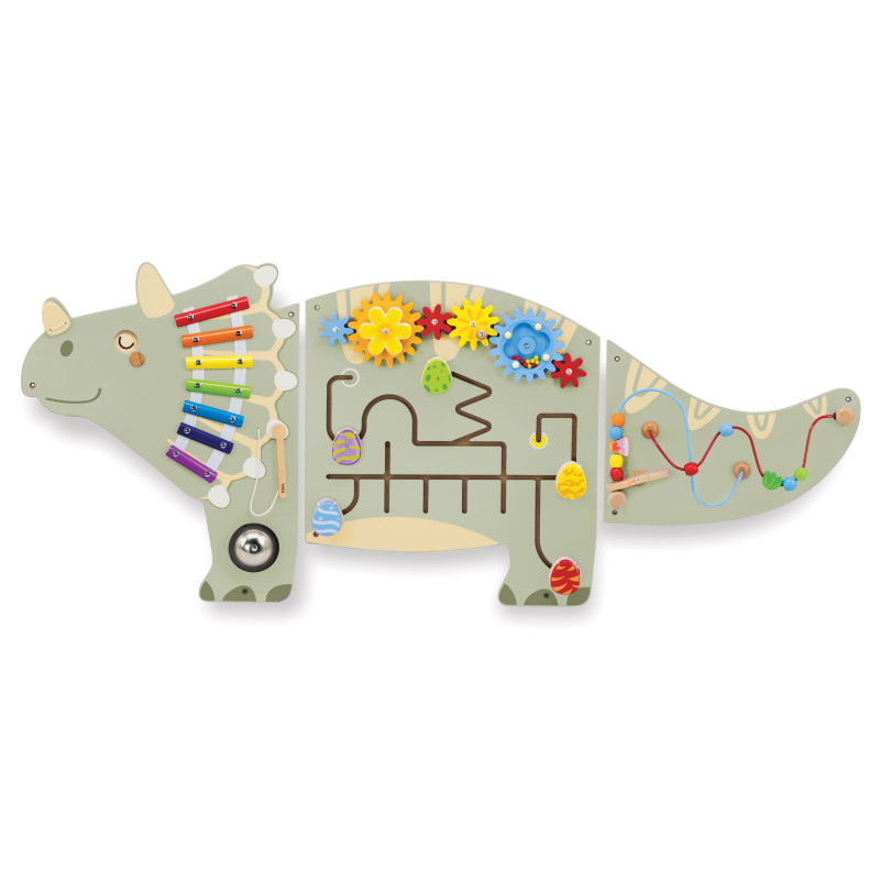 Dinozaura formas koka sienas manipulatīvā tāfele ir aizraujošs un daudzpusīgs izglītojošs līdzeklis, kas paredzēts bērnu vispusīgai attīstībai. Tā palīdz attīstīt sīko motoriku, roku–acu koordināciju un loģisko domāšanu, izmantojot aktīvu un jautru spēli.