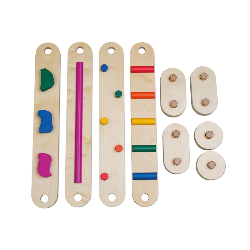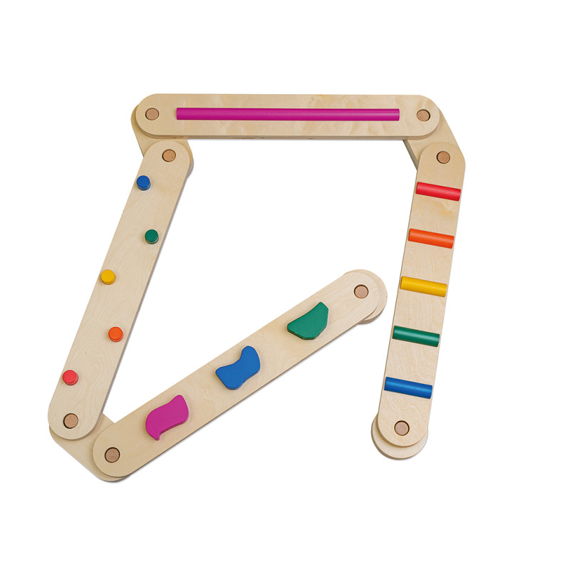 Komplekts ir izgatavots no izturīga un droša lakota koka, kas nodrošina ilgmūžību un stabilitāti. Komplektā ietilpst 5 savienojošie elementi divās formās un 4 celiņi ar dažādiem koka izciļņiem, kas sniedz papildu sensorās sajūtas.