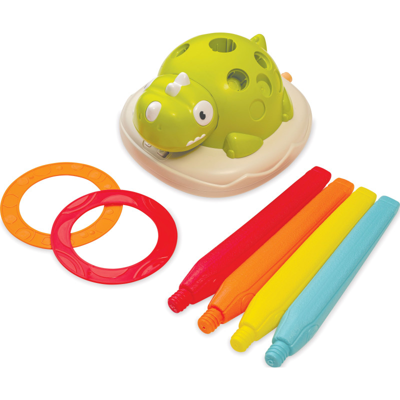 Komplektā ietilpst: dinozaura formas pamatne, roku stabilizators, 2 riņķi un 4 rokas