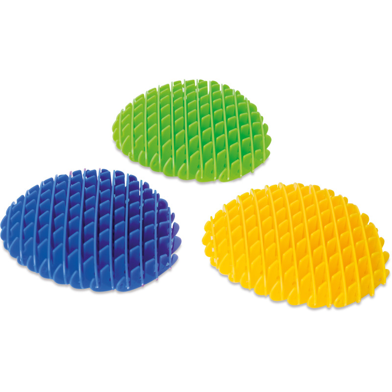 Komplektā ietilpst trīs spilgtu krāsu spiedēji – zilā, zaļā un dzeltenā –, kas nodrošina vizuālu stimulāciju un veicina to izmantošanu dažādās situācijās.